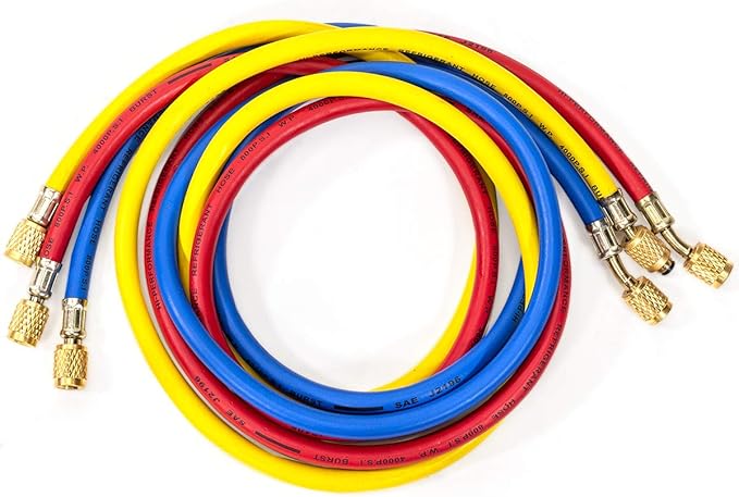- PACKAGE INCLUDED: Multicolored set of three 36” hoses, Manifold Gauge, R134 Can Tap, Vacuum Pump Oil Bottle, Accessories and Storage Bag to keep equipment clean and dust free