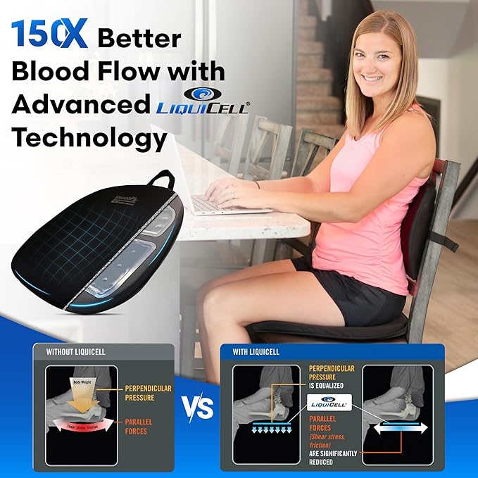 - ADVANCED LIQUICELL TECHNOLOGY – NOT MEMORY FOAM:Unlike memory foam or gel cushions, our patented fluid-filled membranes reduce skin shear and friction, improve blood flow, and help eliminate tingling, numbness, and soreness. Ideal for piriformis and sciatic nerve pain.