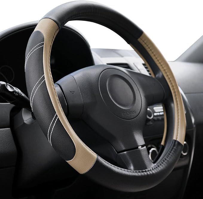 Elantrip Sport Leather Steering Wheel Cover 14 1/2 inch to 15 inch Universal, Padded Soft Grip Breathable for Car Truck SUV Jeep, Anti Slip Odorless Black and Beige