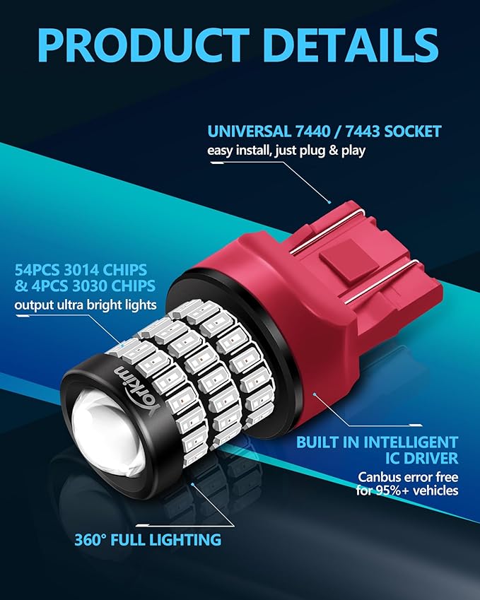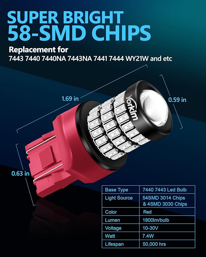 - 【ULTRA BRIGHT】 – Yorkim 7440 LED Bulbs Red comes with 2 pcs of high quality LED bulbs each designed with 54pcs 3014 & 4pcs 3030 chips radially mounted around the bulb to create a wide 360° viewing angle for better, brighter, allover light emission. 400% brighter than original halogen bulbs