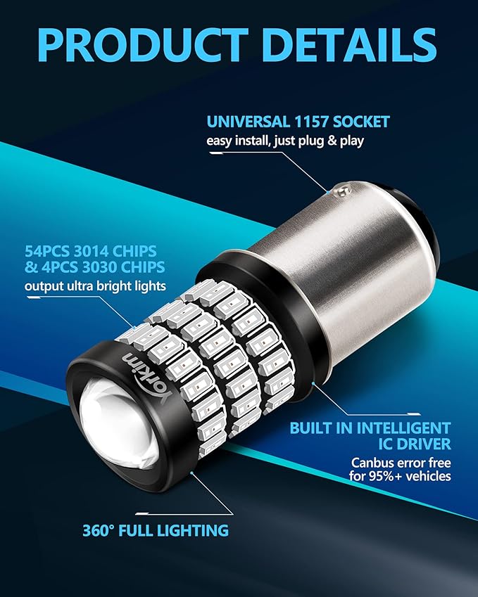 - 【ULTRA BRIGHT】 – Yorkim 1157 LED bulb red is powered by 54 pcs 3014 & 4 pcs 3030 chipsets to offer 400% brighter lights than halogen bulbs for your vehicle