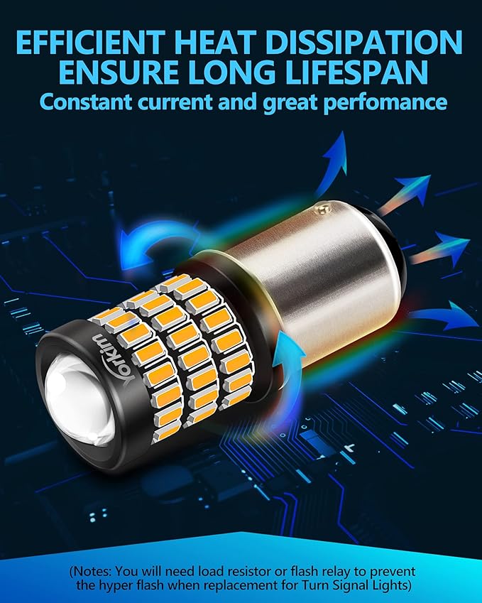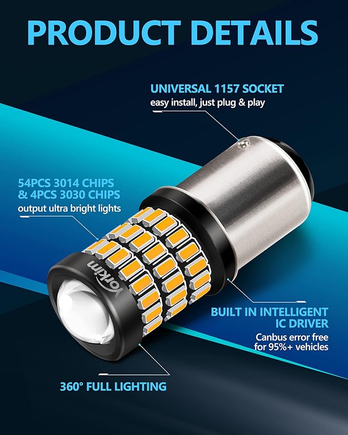 - 【ULTRA BRIGHT】 – Yorkim 1157 LED bulb amber is powered by 54 pcs 3014 & 4 pcs 3030 chipsets to offer 400% brighter lights than halogen bulbs for your vehicle