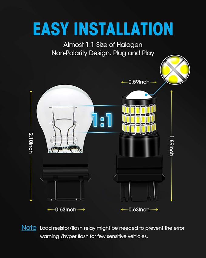 - 【Fitment】This 3157 led bulb is plug and play. Non-Polarity design. Simply plug the bulb in and you are all set. Commonly used for 3056 3057 3156 3157 3357 3457 3757 4057 4114 4157 5702 LED Brake Lights, Backup Reverse Lights, Parking Lights, Turn Signal Lights and etc.**NOTE**: A 50w Load resistor(ASIN:B07KS6KMYG)might be needed to prevent error message or solve the hyper flash issue for some vehicles when replace for Turn Signal Lights. Not suitable for CK sockets