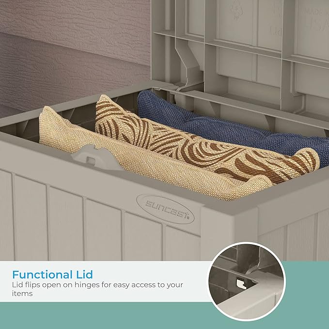 Suncast Small Deck Box-Lightweight Resin Indoor/Outdoor Storage Container and Seat Cushions and Gardening Tools Store Items on Patio, Garage, Yard, 22 Gallon, Light Taupe