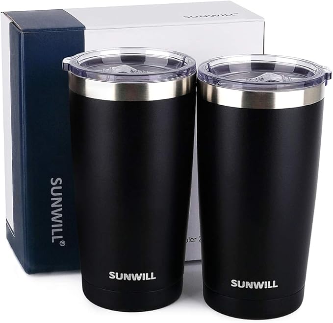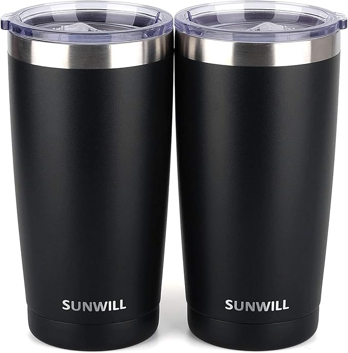SUNWILL Travel Coffee Mug with Lid, 20 oz Tumbler Set of 2, Insulated Stainless Steel Cup for Water, Tea, Ice, Powder Coated Black 2 pack
