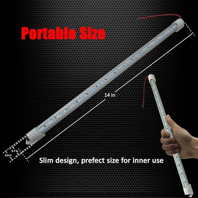 - Easy to install: offer multi ways to install these lights, protable size 14 x 0.8 x 0.6 in (LxWxH). Allows you to install anywhere that equiped with 12V Power.