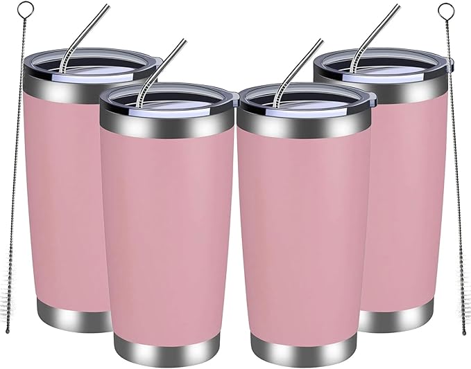 MEWAY 20oz Tumbler 4 Pack Double Wall Vacuum Insulated Travel Mug Bulk, Stainless Steel Tumblers with Lid and Straw, Durable Powder Coated Coffee Cups for Cold & Hot Drinks (Pink, 4)