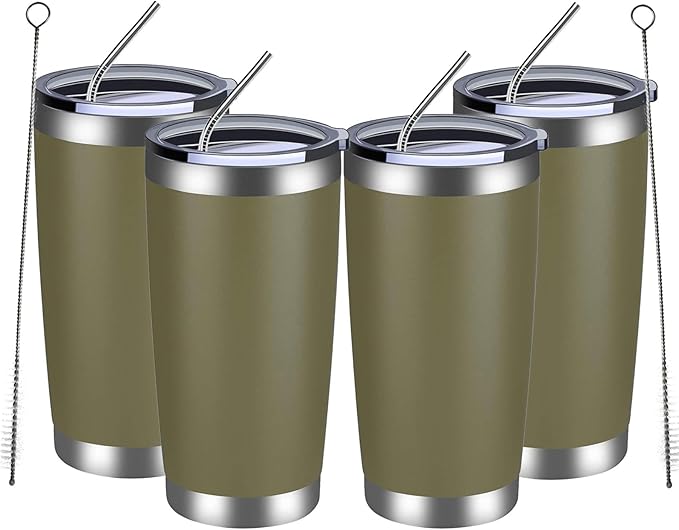 MEWAY 20oz Tumbler 4 Pack Double Wall Vacuum Insulated Travel Mug Bulk, Stainless Steel Tumblers with Lid and Straw, Durable Powder Coated Coffee Cups for Cold & Hot Drinks (Army Green, 4)