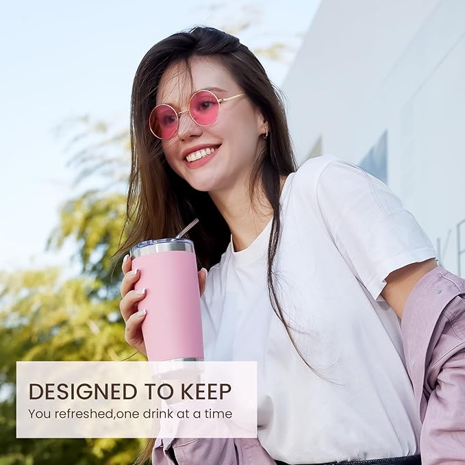 MEWAY 20oz Tumbler 8 Pack Double Wall Vacuum Insulated Travel Mug Bulk, Stainless Steel Tumblers with Lid and Straw, Durable Powder Coated Coffee Cups for Cold & Hot Drinks (Pink, 8)