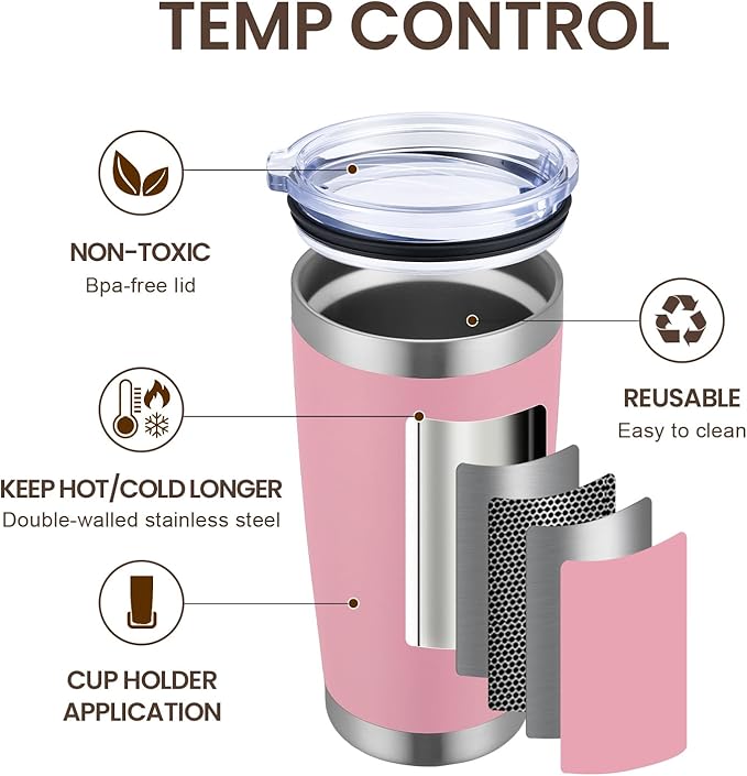 - DURABILITY- 18/8 food grade stainless steel body, No BPA, healthier than plastic cup. The insulated tumbler never sweat due to the Vacuum insulated design. Powder coating on the outside fits more comfortably in your hand, looks good, anti-slip
