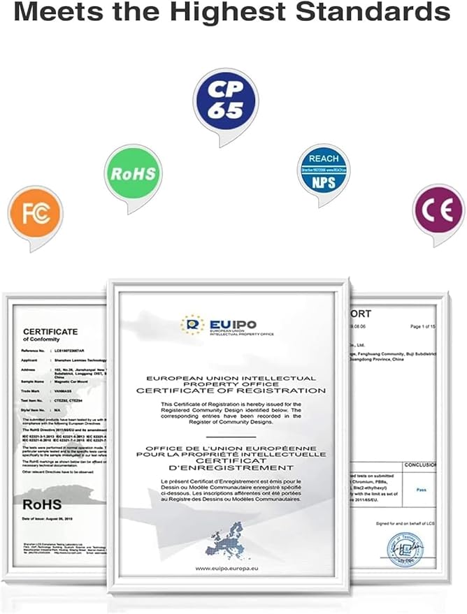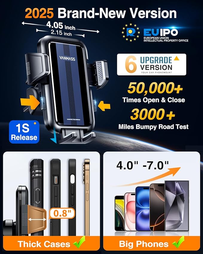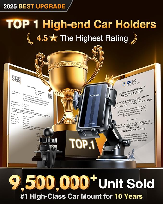- [2025 Best Upgrade Car Phone Holder, Brandnew Flagship Version] 2025 VANMASS car phone holder is certified by all authorities (International Military-Grade Shockproof Cert No.GZMR230200285101, CP65,REACH,RoHS, UKCA), based on Unique Grandmaster Design (Patent No.CN 306455325 S), TOP Durable & Healthy Materials from 20,900 materials & Industry-Leading Safety Tests (Monthly 5,000+ open/close test; 100,000+km rugged road tests)
