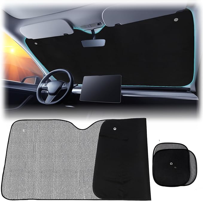 - ★【High Quality Material】:Our windshield sun shade use thick material double bubble silver coated,it reflects and isolates heat conduction effectively.Our side automotive window sunshades use mesh fabric,Which have high visibility provides SPF 30+ Protection, also prevents your passengers/kids/children/pets from getting too hot.