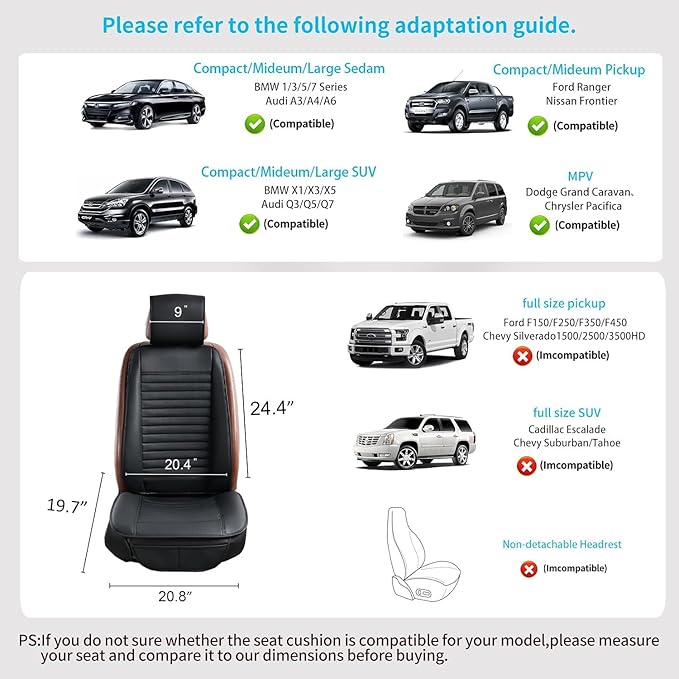 - ✅Includes 2 pack front seat cushions, 2 pack front backrest covers,2 pack front headrest covers. Bottom Seat Cover: 21.8*20.5 inches(L*W),Backrest Cover:21.6*25.2 inches(L*W),Headrest Cover:15.7*9 inches(L*W). Compatible vehicle with detachable headrest and airbag.Incompatible vehicles with built-in Seat belt, non-detachable headrest and large trucks etc. It doesn't fit the seat of Full-Size Truck such as Silverado, TUNDRA, F-150 and full-Size SUV such as Tahoe, Expedition, Acadia.