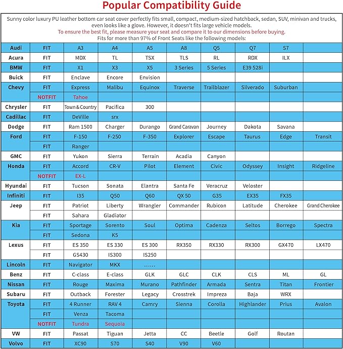 - ✅Premium PU Leather Material-The auto seat cover is made of high-grade soft PU leather, waterproof, easy to scrub, wear-resistant and good breathability. Built-in a layer of highly flexible sponge, four seasons applicable. Maintain the comfort of the buttocks, helps relieve pressure on hips and thighs from driving for a long time. At the bottom of cushion is rubber sole which prevent falling off from your car driver seat.