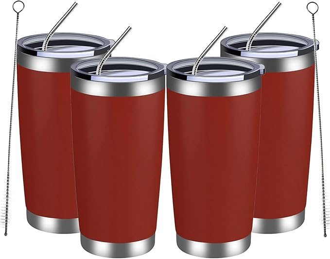 MEWAY 20oz Tumbler 4 Pack Double Wall Vacuum Insulated Travel Mug Bulk, Stainless Steel Tumblers with Lid and Straw, Powder Coated Coffee Cups for Cold & Hot Drinks (Red, Set of 4)