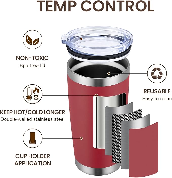 - DURABILITY- 18/8 food grade stainless steel body, No BPA, healthier than plastic cup. The insulated tumbler never sweat due to the Vacuum insulated design. Powder coating on the outside fits more comfortably in your hand, looks good, anti-slip