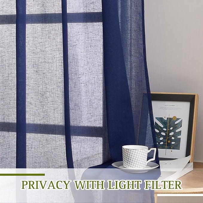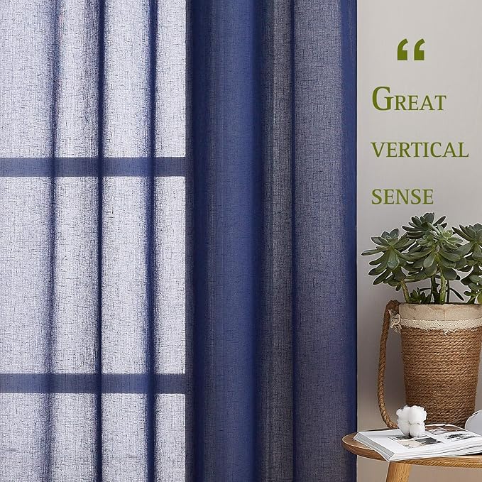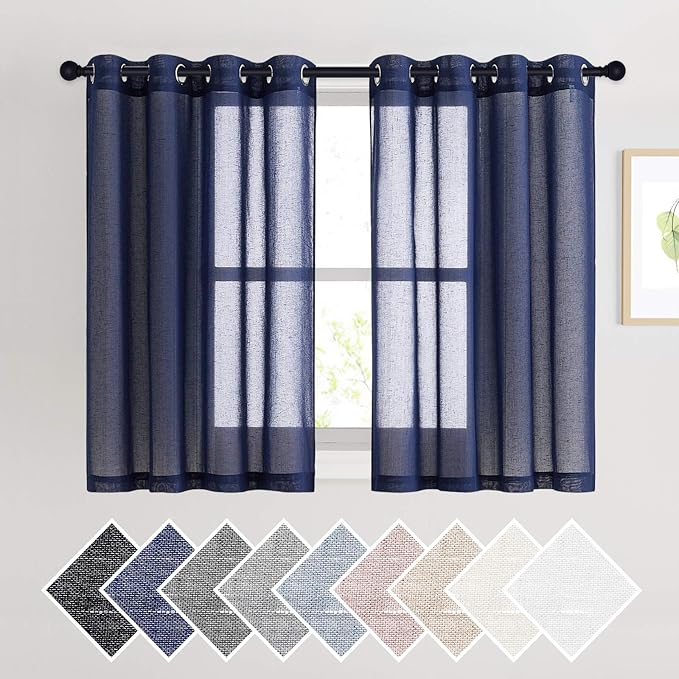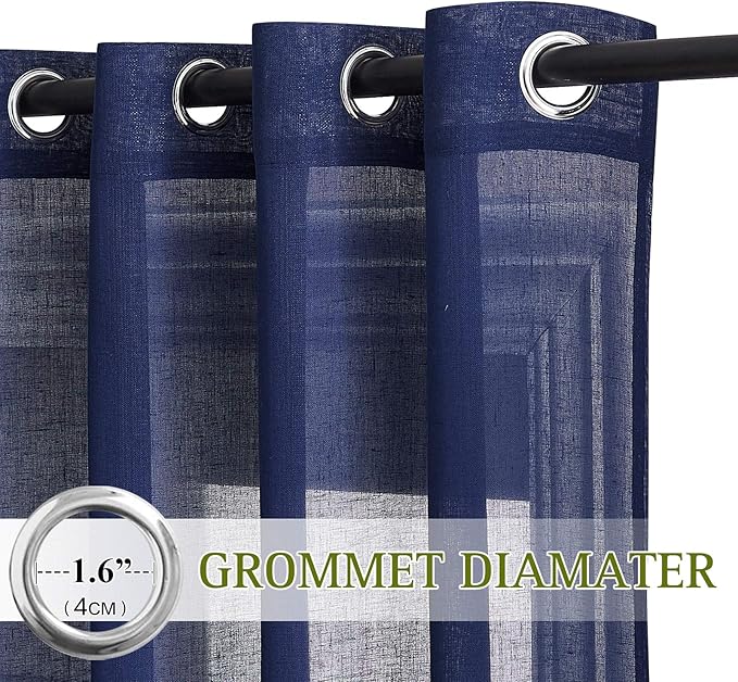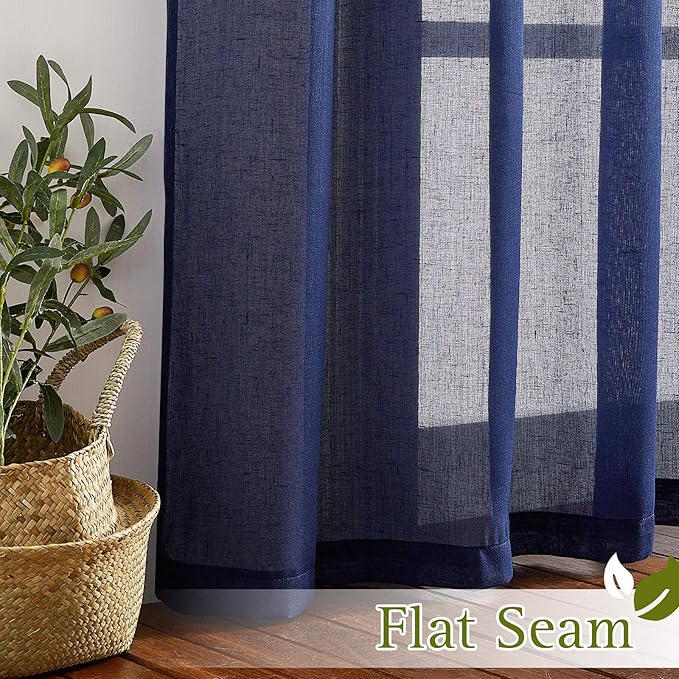 NICETOWN Dark Blue Flax Sheer Linen Curtains for Windows, Grommet Top 45" Length Natural Linen Blend Sheer Drapes Semitransparent Privacy Panels for Farmhouse/Bedroom, 52" Wide, Set of 2
