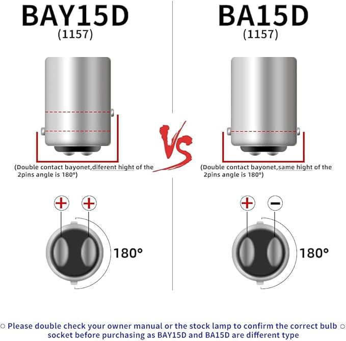 - Standard 1157 BAY15D (S25) Base, Popularly known as 1157 or 1034 Base(TWO PINS 180 degrees opposite, not at the same level, at the top on the base have TWO contact point)