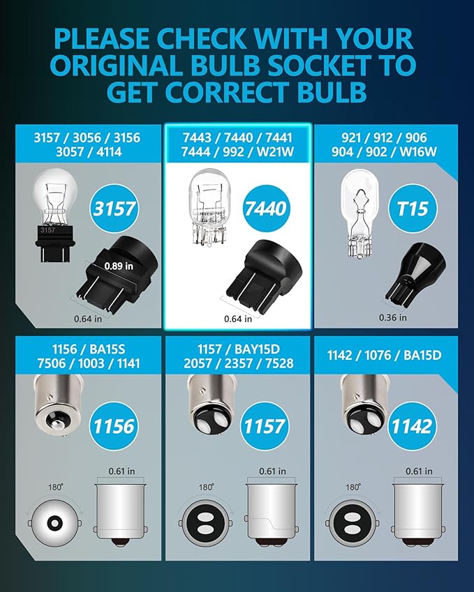 - 【FITMENT】- Fit for 7443 7440 7440A 7440NA 7440SV 7443NA 7441 7443R 7444 992 WY21W W21W ect, replacement for Brake Lights, Tail Lights, Parking Lights, Turn Signal Lights, Side Marker Lights, etc. Extra load resistor might be needed to solve the hyper flashing.