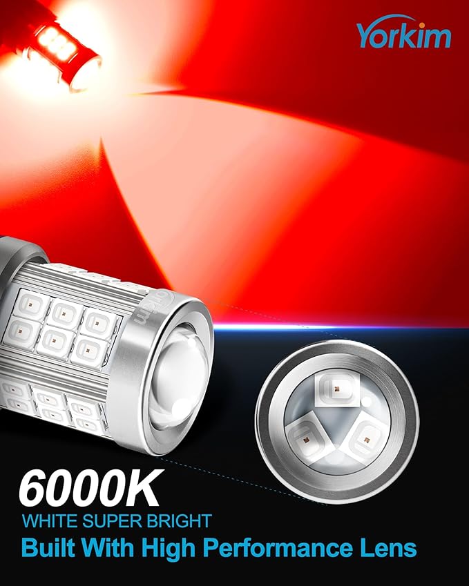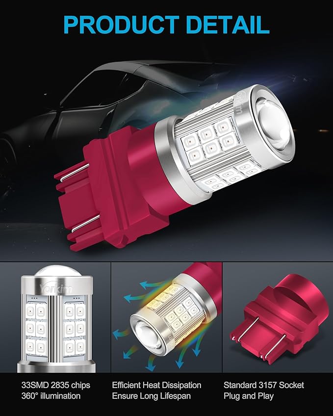 - 【HUGE IMPROVEMENT】- Yorkim 3157 LED bulb is built with 33-SMD 2835 LED chips, 300% Brighter than halogen bulbs, provides lots more light when going in brake