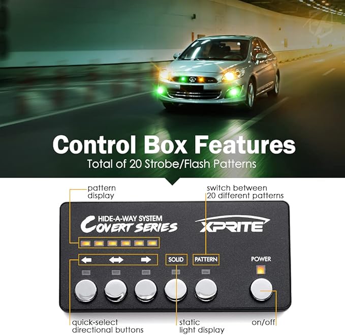 - EXTRA ACCESSORIES SOLD SEPARATELY: Extension 10FT Cable Wire, ASIN: B00G8SFLKW; Replacement Amber LED Light Bulb, ASIN: B00PODZ3F0. (Please notice that we are not responsible for compatibility issues with other brands and they only fit for Xprite 52013 Covert Series hideaway strobe lights kit.)