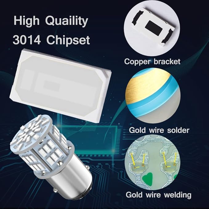 - High Quality: 2357 Bulb with upgrade 3014 Chipset, copper bracket, gold wire solder, longer life span. Built-in intelligent constant current IC driver. Plug And Play, 360 degree Beam Angle,300% brighter than original halogen bulb, lower power consumption, 15% of halogen bulbs consumption.