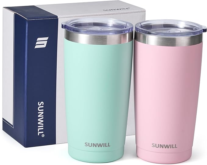 SUNWILL Travel Coffee Mug with Lid, 20 oz Tumbler Set of 2, Insulated Stainless Steel Cup for Water, Tea, Powder Coated Sakura & Mint