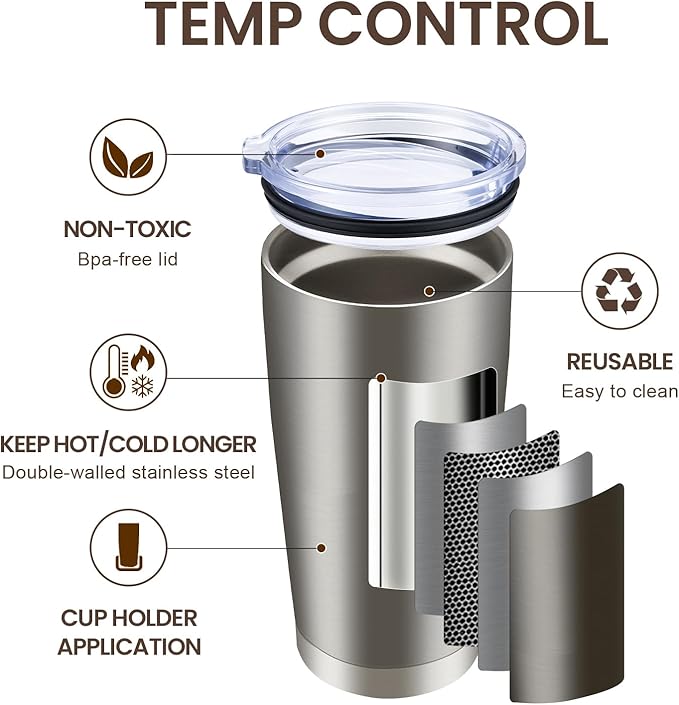 - DURABILITY- 18/8 food grade stainless steel body, No BPA, healthier than plastic cup. The insulated tumbler never sweat due to the Vacuum insulated design. Powder coating on the outside fits more comfortably in your hand, looks good, anti-slip