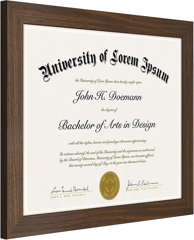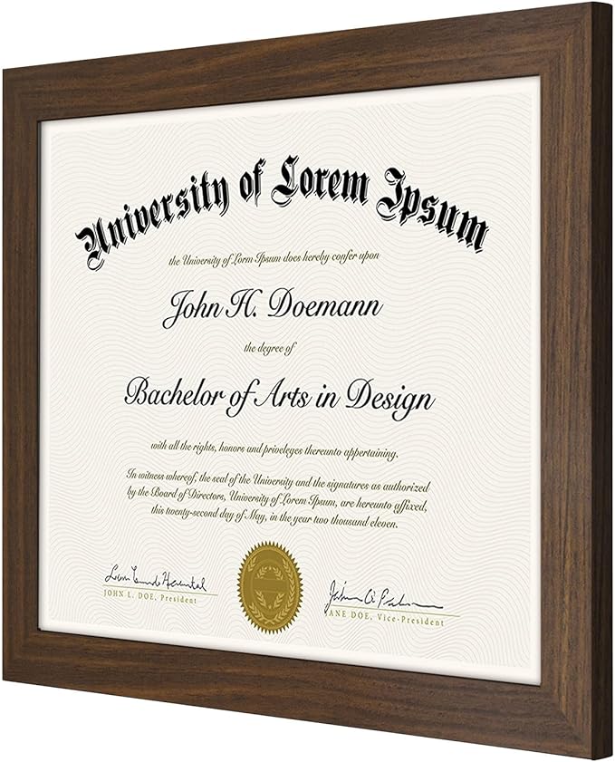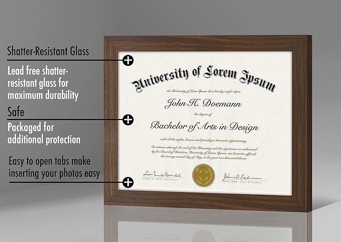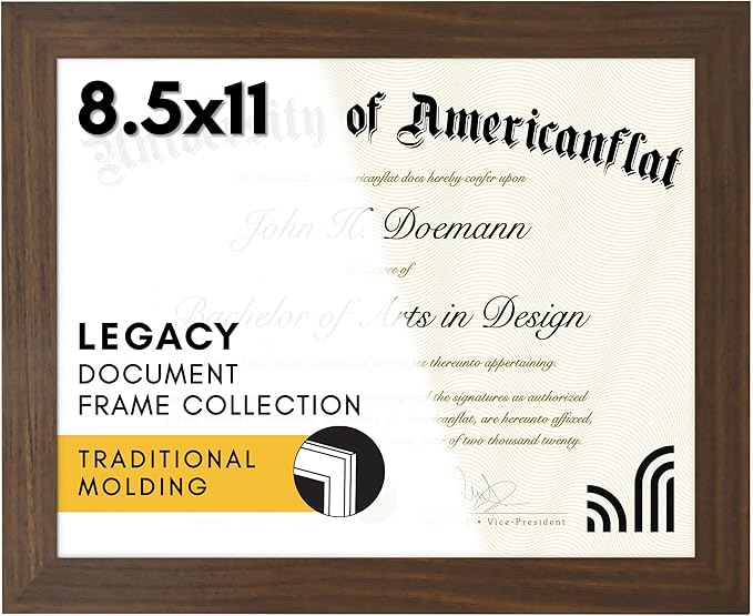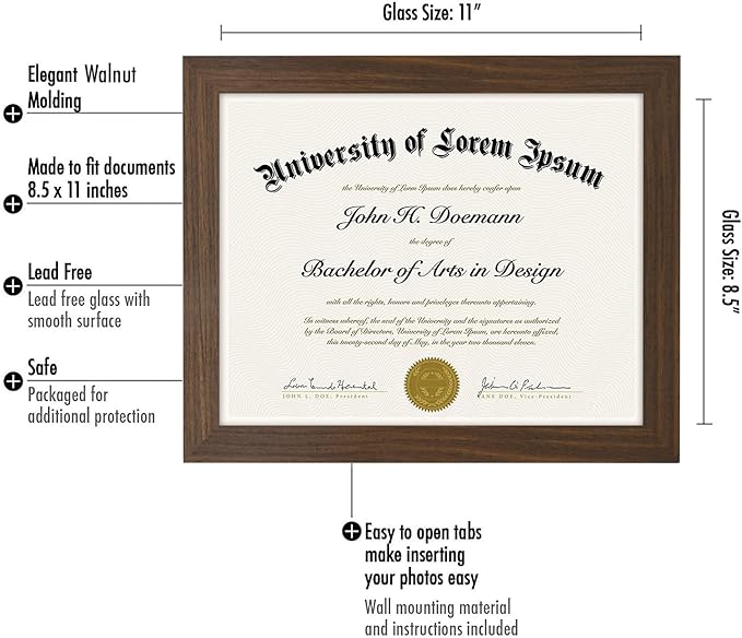 - Design: Walnut 8.5x11 inch diploma frame, perfect for your certificates and documents; comes with hanging hardware for hassle-free display in both horizontal and vertical formats to hang flat against the wall; includes an easel stand for tabletop or desktop display