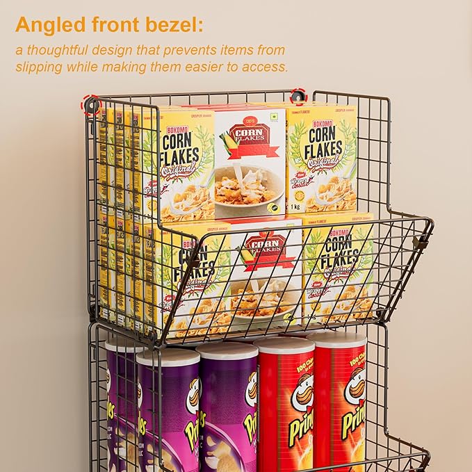 - Versatile Floor and Shelf Pantry Storage:Our storage cart features a modular, detachable design that can be used both as a 3-tier floor-standing rack or as separate shelf storage. This flexibility means you can either stack the baskets for easy access or remove them to place on shelves or countertops. It provides a customizable storage solution to suit any space in your home, from a playroom to a storage closet, helping you organize without taking up extra room.