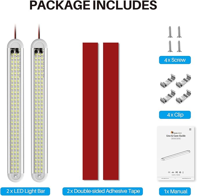 - 【Total Package】 - The package includes 2*12v led lights, 2*strong self-adhesive tape, 4*stainless steel clip and 4*stainless steel screw. And the switch is located at the end of the light bar, which could be conveniently operated any time necessary. This LED car interior light bar approved by multi-security certificates will ensure the safety of you and your vehicle. If you have any questions, please contact us in time and we will help you solve them.