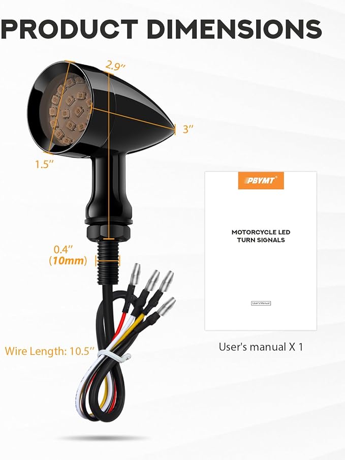 - VARIOUS APPLICATION - The bullet turn light is a versatile lighting solution designed to fit a wide range of applications, including motorcycles, eBike and more. With its IP67 waterproof, these LED motorcycle turn signals are made to withstand harsh weather conditions such as rain, fog, and even extreme environments.