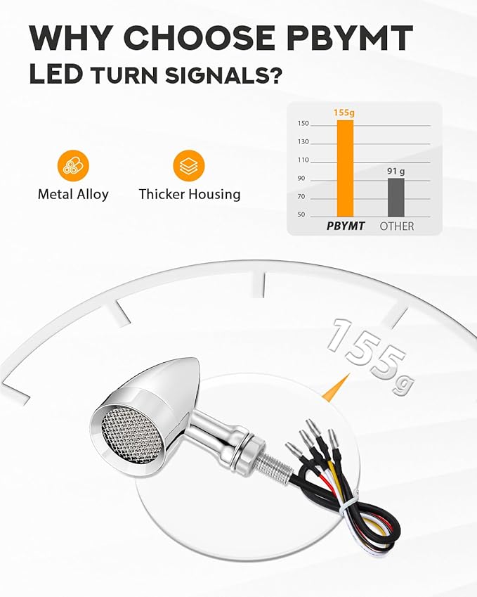 - ULTRA BRIGHTNESS - The upgraded 2PCS LED lights have high-power SMD chips for increased visibility, being over 3 times brighter than halogen lights, and with a lifespan exceeding 50,000 hours. The bullet turn signals feature 24 built-in LED chips and a safety circuit design for overload protection.