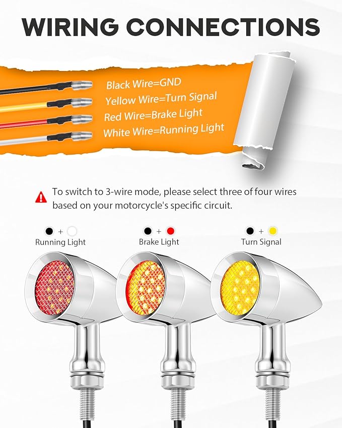 - 4 WIRES SET UP - Black wire for ground, red wire for brake lights, white wire for running lights, and yellow wire for turn signal. To switch to 3-wire modes, select three of the four wires based on your motorcycle's specific circuit.