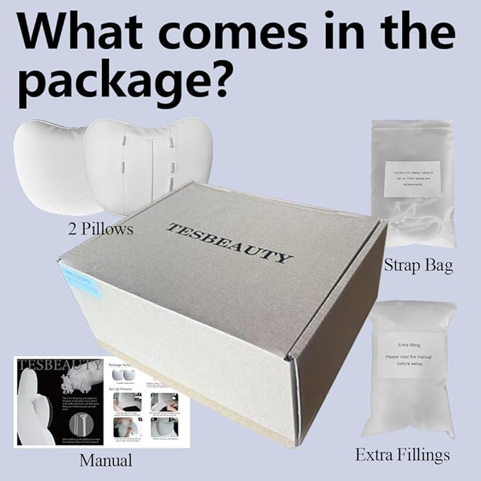 - Package includes----2 leather Tesla headrest pillows, 2 elastic attachment straps, 1 extra filling bag, and 1 piece of user manual. Also extra 2 straps are provided in the bag as replacements. One pillow only needs one strap to set it up, but you could use 2 straps to set up 1 pillow in order to make the pillow more tightly attached onto your headrest. But 1 strap to set up 1 pillow usually meets your needs.