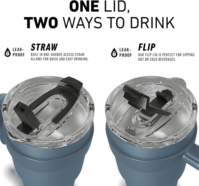 - 2 in 1 LID: Our Hydrapeak Roadster stainless steel tumbler with handle features a unique 2-in-1 lid allows you to sip your drinks with the flip up Sip lid. Additionally, the non-slip rubber base prevents sliding and scratching along with a sleek modern tumbler look.