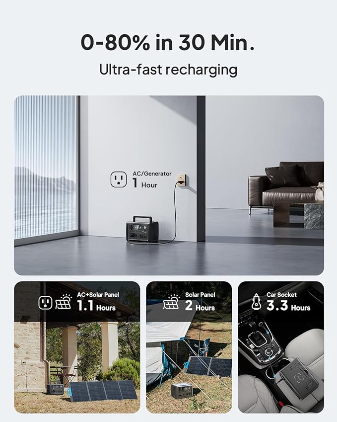 - [Ultra-fast Charging] - No bulky power brick, a single cable is good to charge EB3A at most 350W; you also can use the PV+AC together for 80% SOC in just 30min. (Solar charging cable not included.)