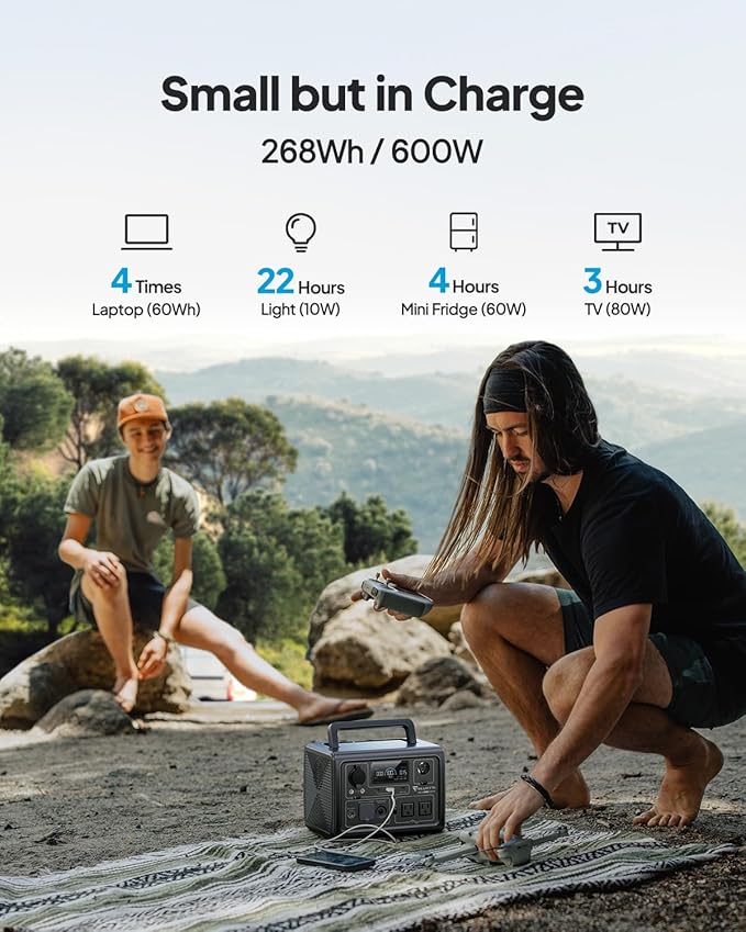 - [Tiny but Mighty] - With a 600W AC inverter, 268Wh LiFePO4 battery pack, and 9 outlets, this solar generator will keep your essential devices powered on the go or during a home power outage.