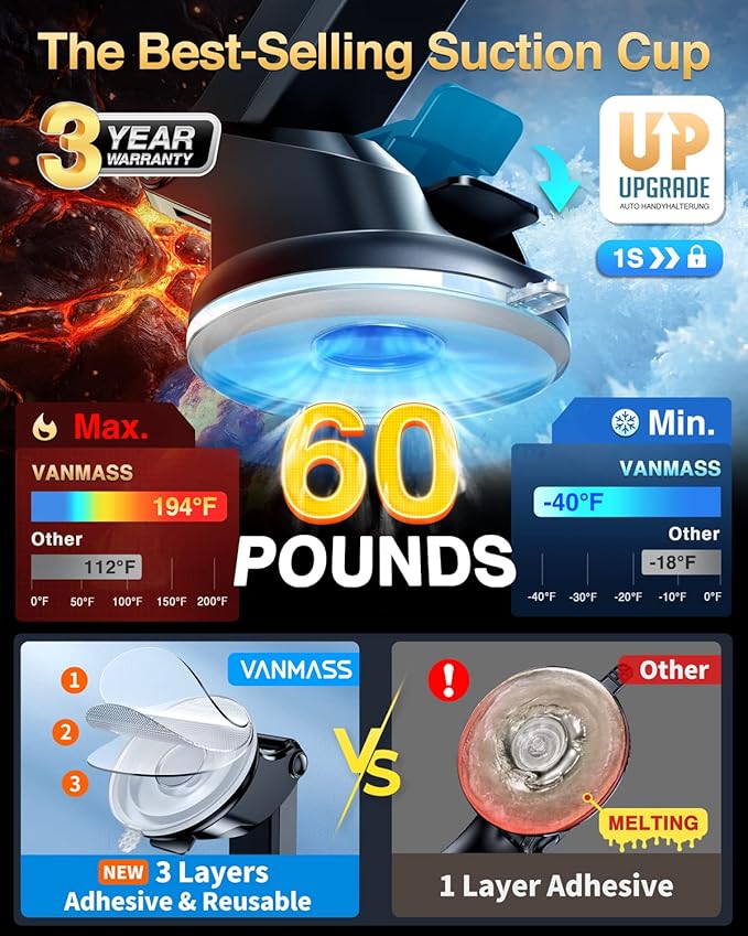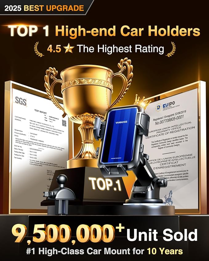 - 【VANMASS Leading the standard】Through 8 years of technical expertise, We use the best designs, and leading materials with world-first-class standards & tests to build this car phone cradle that lives at least 5 years. The Ultra Stable suction cup, anti-live heat & cold material, Smoothest One-Click Release, Upgraded Mirror Panel, and deeper Clamp Arm for Most Compatibility and protection. Make it the most preferred car mount in the class.