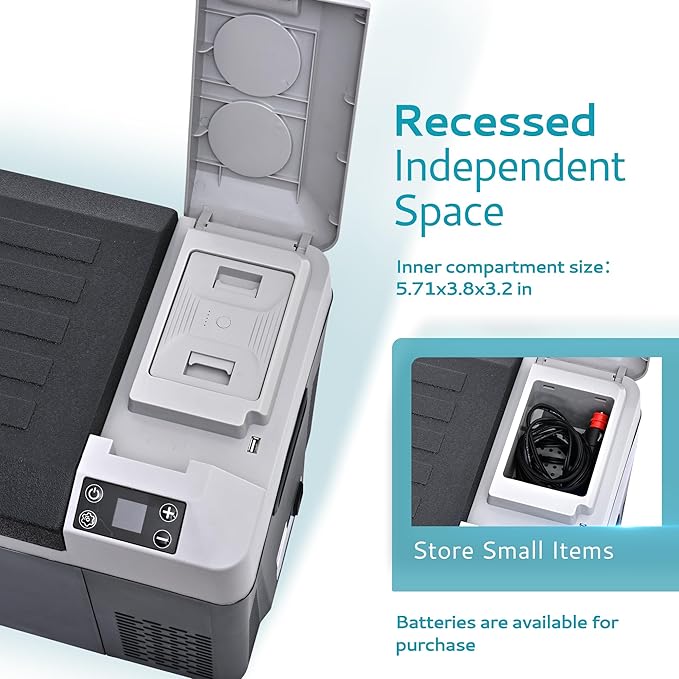 - User-friendly Design & Control Panel; The 12v refrigerator comes with two recessed handles and hooks for easy portability. The built-in LED light allows for convenient access to food at night, while the USB port keeps your phone charged on the go. The simple control panel offers clear button functions and displays the portable freezer's operating status, letting you adjust the temperature range at any time