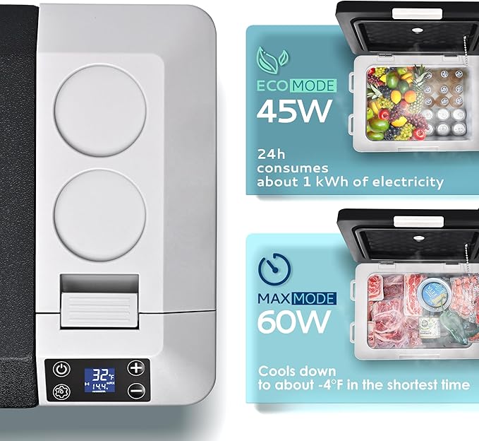 - Battery Protection & Multiple Power Supplies; The 12 volt cooler features a three-level battery protection system, adjustable from 9.6V to 12.4V in L/M/H modes, preventing overload or vehicle battery drain. This protection makes the camping fridge suitable for use in sedans, SUVs, trucks, and most other vehicles. It can be powered by either DC or AC, making it versatile for various scenarios