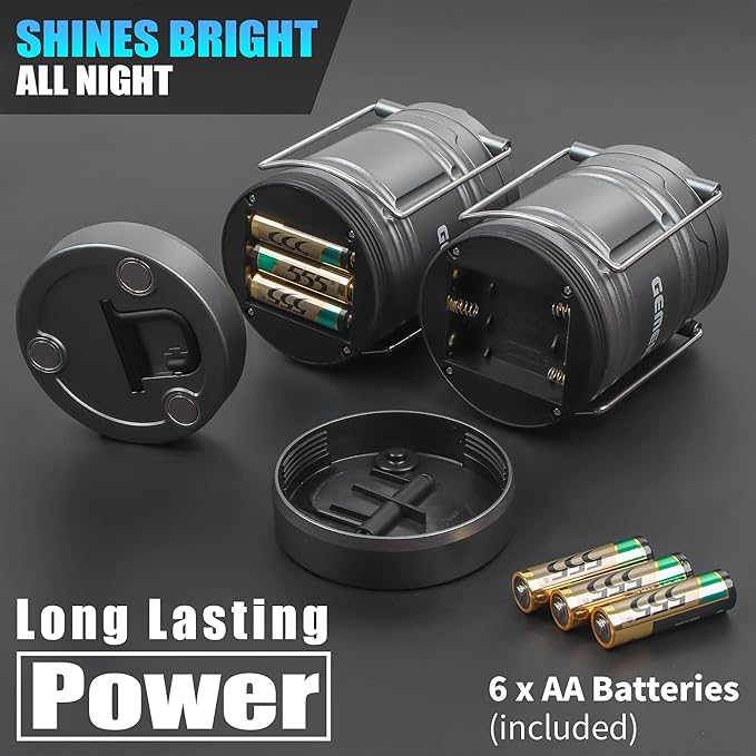 - ✔【Battery Powered】You won't be able to get a charge for long power outages or outdoor camping, but with AA batteries, you can replace them freely. The GEMEK portable lights powered by 3 x 1.5V AA batteries, Light up to more than 48 hours of regular, continuous use with enough battery capacity. (6 AA battery included)