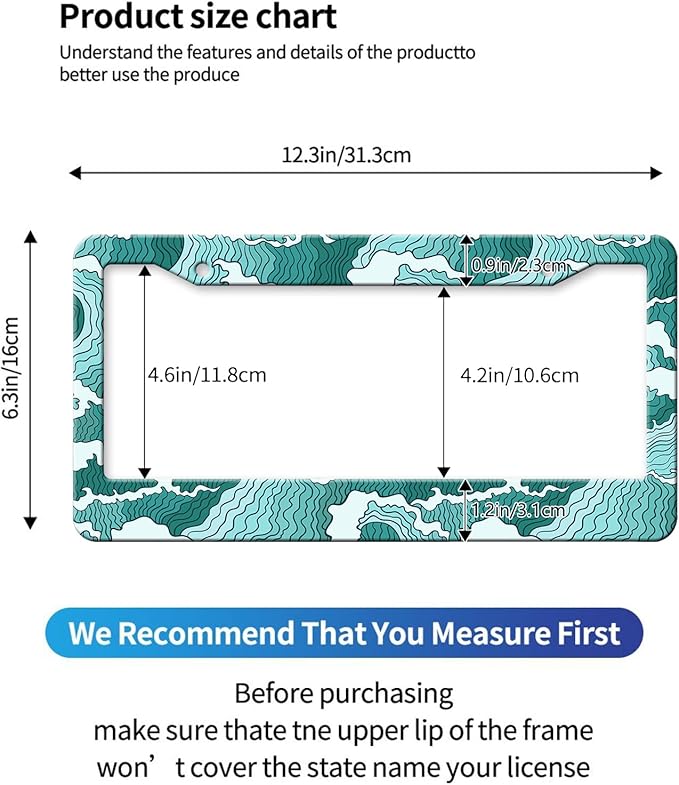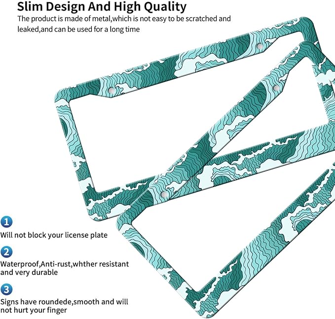 - 【Specially Design】Blue and Green Wave license plate frame,using advanced printing technology,the color will always remain bright.Decorations for Cars,Suvs,Truck,Garage,Bedroom,garden.