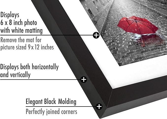 - Our 9x12 frames with classic molding are crafted from engineered wood (MDF) and display 9x12 photos or 6x8 photos with mat (actual mat size: 5.5x7.5"). The shatter-resistant glass adds a pristine finish, making this frame truly stand out.