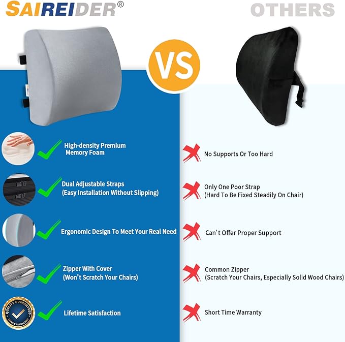 SAIREIDER Lumbar Pillow, Memory Foam Office Chair Back Support Pillows Back Pain Relief Improve Posture, Lumbar Support Pillow for Car、Gaming Chair、 Home Chair, Double Adjustable Straps(Grey)