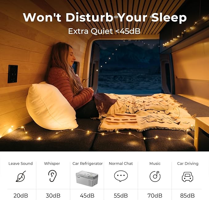 - Low Noise: The truck freezer is designed with 45dB of low noise to make sure you have a good sleep after long driving. This camping fridge also has a shock-proof design to face the uneven road, operating with no problem in case of a 30° inclination when you are off-road