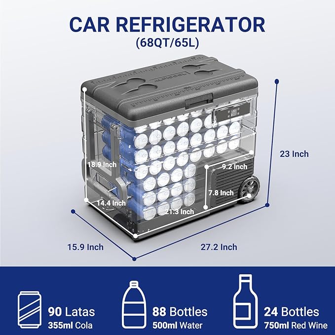 - 【65L Large Capacity】BODEGACOOLER 12v car refrigerator has a 65L large capacity,you can cool drinks,seafood,snacks,meat,beverages,etc at the same time.This single zone car refrigerator is best choice for camping,party,boating,fishing,outdoor and travel and fully meets RV or truck drivers,boat owners and campers needs.
