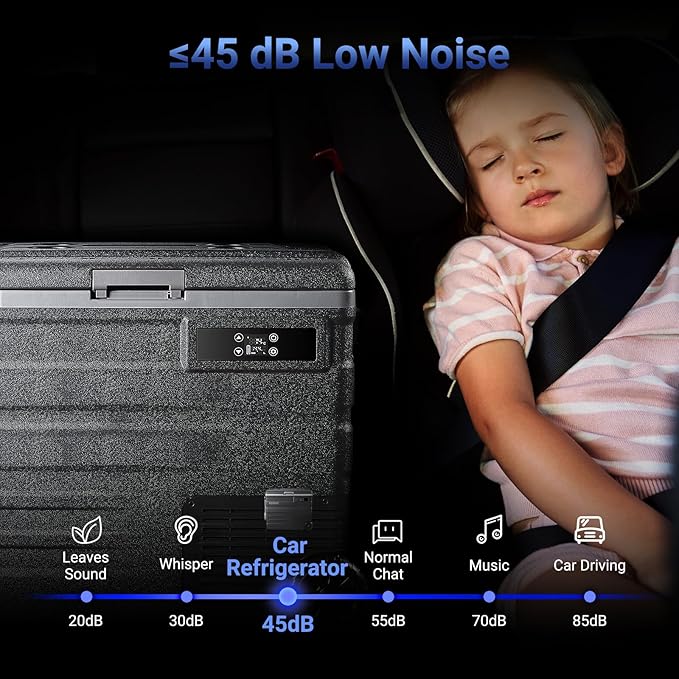 - 【Low Noise and Voltage Protection】The noise level of this car fridge is below 45 db that will not affect your driving or the rest of passengers.Also,H/M/L 3-level low-voltage protection that can prevent the car power supply from being overloaded or short-circuited which can make you to enjoy your journey,road trip,travel and other outdoor activities.