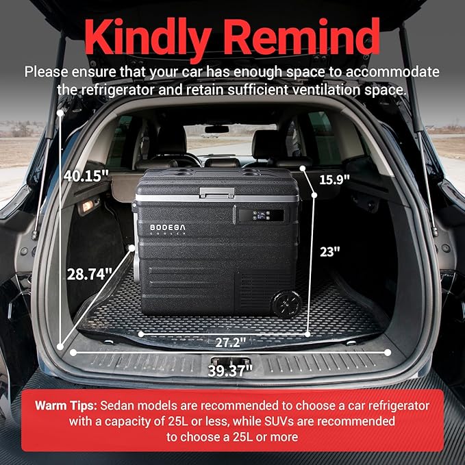 - 【Handle & Wheels Design】12v car refrigerator has heavy-duty handle and wheel is easier to move and portable.This 12 volt fridge with friendly design is very convenient for your daily use.BODEGACOOLER car refrigerator compatible with various power sources to meet your life needs.
