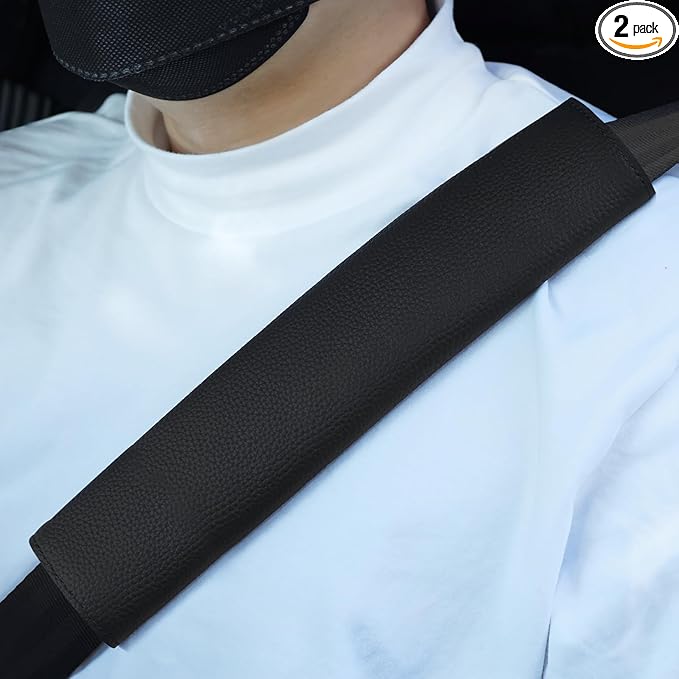 - Reduce Stress and Fatigue - 2 Pack Long Black Car Seat Belt Covers. Wearing a seat belt is uncomfortable, and clothes are prone to pilling under the friction of the seat belt? The leather seat belt cover can minimize fatigue when driving. Thickened safety belt leather shoulder pad prevents shoulder and neck from being bound or stressed, scratched. The soft and skin-friendly leather cover protects our skin and clothes, so that your clothes will not pilling due to friction.